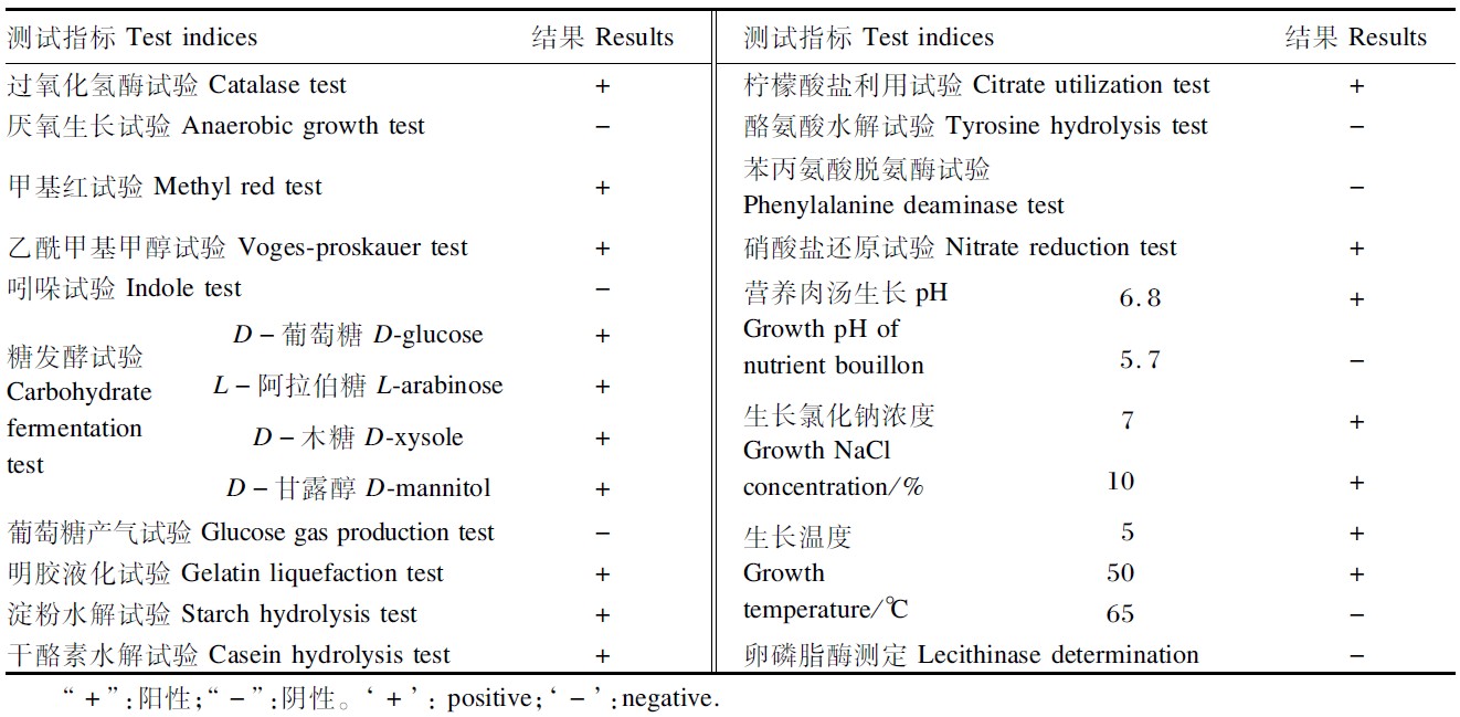 菌株形态学特征鉴定用革兰氏染色法[17]和孔雀石绿芽孢染色法[18],生理生化特性鉴定参考东秀珠等[19]和Garrity等[20]的方法进行。为进一步确认,提取菌株基因组DNA,采用细菌通用引物(27F:5′-AGAGTTTGATCCTGGCTCA-3′,1492R:5′-GGTTACCTTGTTACGACTT-3′)[21]对菌株的16S rRNA基因进行扩增。PCR纯化产物和pGEM-T进行T连接后转化大肠杆菌DH5α,测序由北京华大基因生物公司完成。将测序结果在NCBI上用BLAST程序与GenBank中16S rRNA基因序列进行同源性分析,用Mega 5.1中的邻接(neighbor-joining)法构建系统发育树。