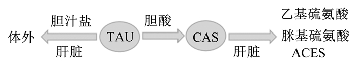 牛磺酸转运蛋白(taurine transporter,TAUT)是牛磺酸转运过程中的主要转运蛋白,其缺乏将导致机体出现功能障碍。研究发现,TAUT缺乏导致小鼠的脑、肝脏和肾脏中的牛磺酸含量降低70%~90%,心肌和骨骼肌中的牛磺酸含量降低98%[15]。Ito等[16]研究表明,将小鼠TAUT基因敲除后,小鼠脑和骨骼肌中牛磺酸含量显著降低,并出现心肌细胞萎缩、线粒体和肌纤维损伤及心脏功能障碍。因此证明,牛磺酸在体内的代谢受TAUT基因表达的调控,TAUT对维持牛磺酸平衡状态起到关键作用。摄入体内的牛磺酸通过TAUT在小肠中被吸收进入血液,经血液输送到身体各个器官以达到平衡浓度[17]。牛磺酸在体内的代谢路径主要有以下几条:1)部分牛磺酸与胆汁结合,少部分转化为羧乙磺酸,经尿液排泄;2)与胆酸可结合转化为牛磺胆酸(taurocholic acid,CAS),在肝脏中通过转氨基转化为乙基硫氨酸、脒基硫氨酸和N-氨基甲酰牛磺酸(N-carbamoylmethyl taurine,ACES)[13, 18]。肝脏可通过调节TAUT基因的表达来维持牛磺酸吸收和排出的动态平衡,使牛磺酸含量处于相对正常的水平[13](图 2)。