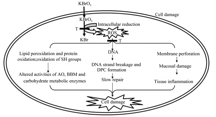 KBrO3:溴酸钾potassium bromate;KBr:溴化钾potassium bromide;ROS:活性氧自由基reactive oxygen species;T:牛磺酸taurine;Intracellular reduction:胞内还原;Cell membrane:细胞膜;Lipid peroxidation and protein oxidation:脂质过氧化和蛋白质氧化;oxidation of SH groups:巯基氧化;Altered activities of AO, BBM and carbohydrate metabolic enzymes:抗氧化、刷状缘膜和碳水化合物代谢酶活性改变;DNA strand breakage and DPC formation:DNA链断裂和DNA蛋白质交联形成;Slow repair:缓慢修复;Membrane perforation:膜穿孔;Mucosal damage:黏膜损伤;Tissue inflammation:组织炎症;Cell damage:细胞损伤。 图 3 牛磺酸对KBrO3造成的肠细胞代谢改变、细胞膜破坏和氧化应激的化学保护作用 Fig. 3 Chemoprotective effects of taurine on KBrO3 induced alterations in intestinal cell metabolism, membrane integrity and oxidative stress[37] |