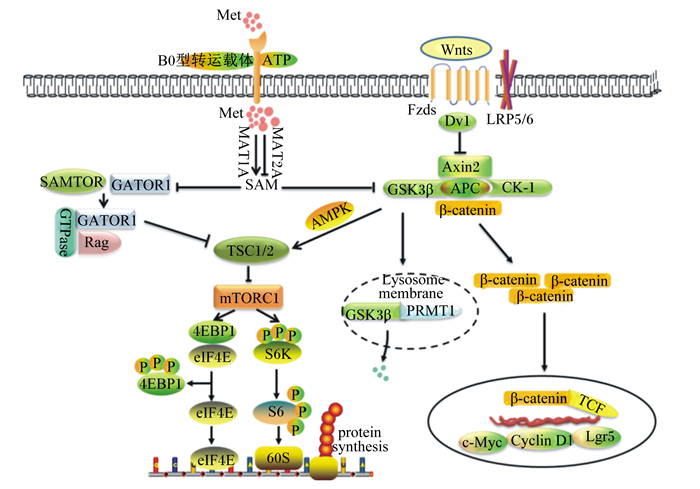 Albrecht等[50]研究发现,在Met缺乏的培养基中补充Met或SAM均会激活Wnt/β-catenin信号,而同时加入蛋氨酸腺苷转移酶2型(methionine adenosine transferase 2A,MAT2A)阻断Met转化为SAM,Met对Wnt/β-catenin的调节作用消失,说明Met能够通过一碳代谢控制细胞内SAM水平从而调控Wnt/β-catenin活性。细胞内SAM含量降低会抑制Wnt/β-catenin信号传导,同时也下调了Wnt诱导的溶酶体活性。虽然目前尚不清楚Wnt/β-catenin信号是否通过溶酶体重新连接代谢途径,但是毫无疑问,SAM是溶酶体保持活性所必需的。此外,SAM是精氨酸甲基转移酶1(arginine methyl transferase 1,PRMT1)的甲基供体[51]。作为Wnt信号成分之一,PRMT1在隐窝中表达水平较高,其活性也随着SAM水平的降低而降低。Zhou等[51]进一步发现,SAM可促进胞质中的PRMT1和GSK3锚定在内溶酶体,从而加速GSK3的降解。由此可知,SAM调控Wnt/β-catenin主要通过PRMT1诱导GSK3的降解。