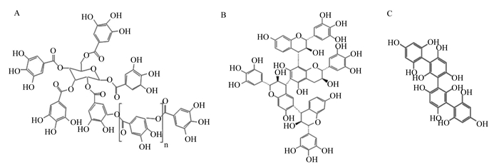 A:水解单宁hydrolysable tannins;B:缩合单宁condensed tannins;C:褐藻多酚phlorotannins。 图 1 3种常见单宁的分子结构式 Fig. 1 Molecular structure of three common tannins[13] |