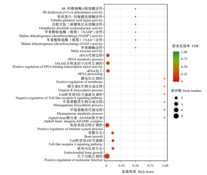 对高能组和低能组差异表达miRNA的预测差异表达靶基因进行GO功能富集分析,发现有192个显著富集的GO功能,其中147个富集在生物过程(biological process, BP),11个富集在细胞组分(cellular component, CC),36个富集在分子功能(molecular function, MF)。图 1显示了富集最显著的20个GO功能,其中富集较多的是免疫系统过程正调控和分子功能正调控,涉及的基因有整合素亚基beta3(ITGB3)、RAB7B RAS癌基因家族成员(RAB7B)、甘露糖结合凝集素(MBL)、胰岛素样生长因子结合蛋白2(IGFBP2)、淋巴细胞抗原96(LY96)(免疫系统过程正调控)和RAB7B、鸟苷酸环化酶激活物1A(GUCA1A)、RasGEF结构域家族成员1C(RASGEF1C)、G蛋白信号调节因子6(RGS6)、印度hedgehog信号分子(IHH)、ARFGEF家族成员3(ARFGEF3)、高迁移率组核小体结合结构域3(HMGN3)、谷氧还蛋白(GLRX)(分子功能正调控),分别是5和8个,占总差异表达基因的12.2%和19.5%,说明它们是较为重要的GO功能。