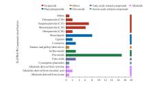 Terpenoids:萜类;Phenylpropanoids:苯丙素类;Others:其他;Flavonoids:黄酮类;Fatty acids related compounds:脂肪酸相关化合物类;Amino acids related compounds:氨基酸相关化合物类;Alkaloids:生物碱类;Triterpenoids (C30):三萜类(C30);Sesquiterpenoids (C15):倍半萜类;(C15);Monoterpenoids (C10):单萜类(C10);Diterpenoids (C20):二萜类(C20);Monolignols:单木质素醇类;Lignans:木脂素类;Coumarins:香豆素类;Tannins and galloyl derivatives:鞣质及其没食子酰衍生物;Isoflavonoids:异黄酮类;Flavonoids:黄酮类;Fatty acids:脂肪酸类;Cyanogenic glucosides:生氰苷类;Alkaloids derived from tyrosine:酪氨酸衍生生物碱;Alkaloids derived from nicotinic acid:烟酸衍生生物碱;Alkaloids derived from lysine:赖氨酸衍生生物碱。