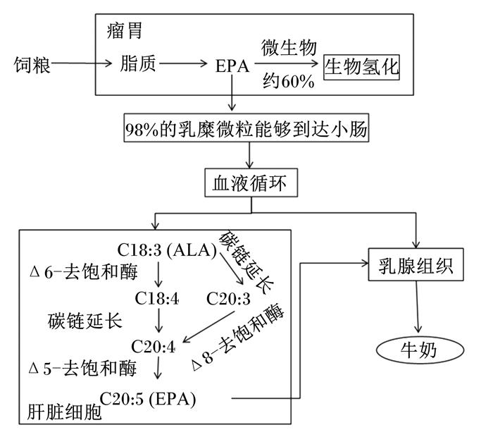 2 牛奶中EPA的来源牛奶中的EPA一部分在奶牛肝脏中合成,但是EPA在奶牛体内的合成量非常少,并且其合成原料——α-亚麻酸(ALA)在机体中也无法合成[25-26]。因此,牛奶中EPA很大一部分来源于饲粮中直接添加的富含EPA饲料原料或是富含ALA饲料原料。